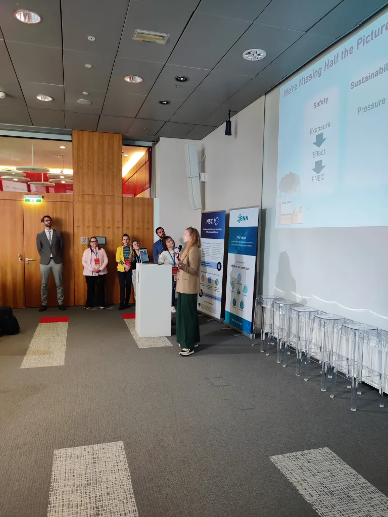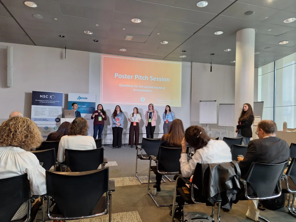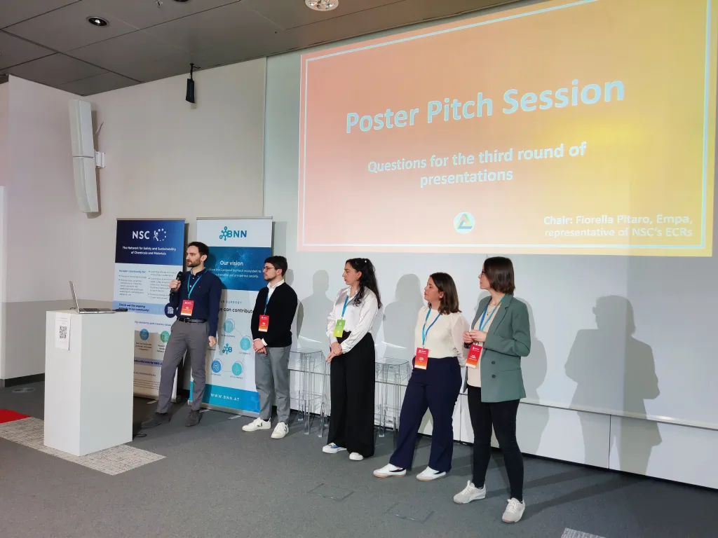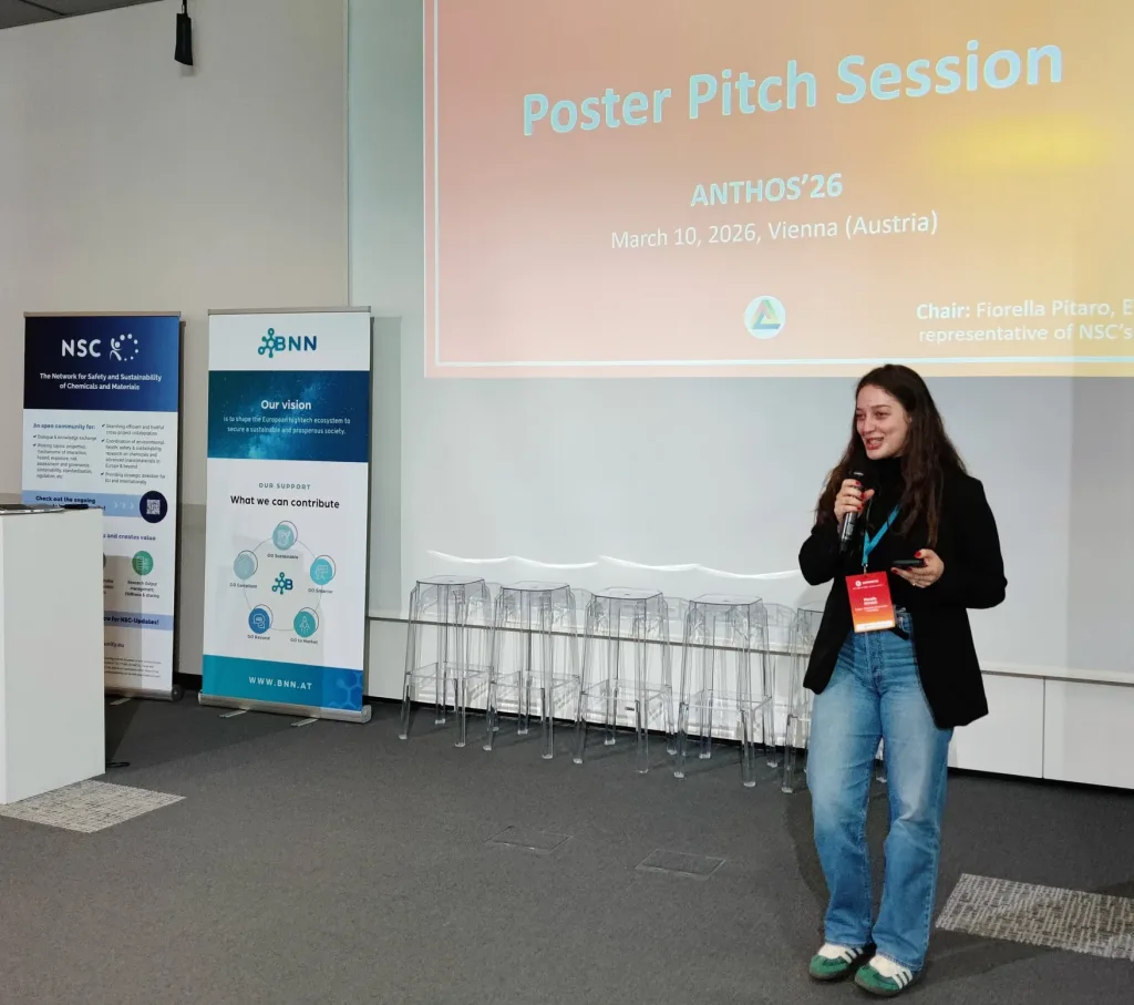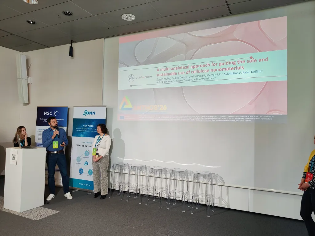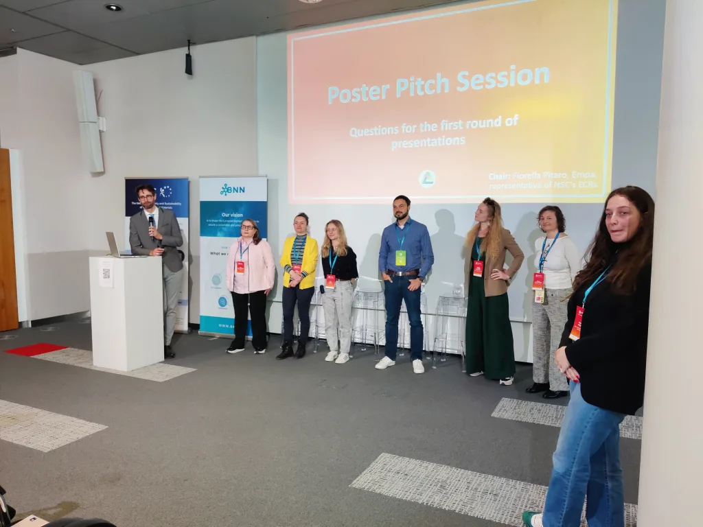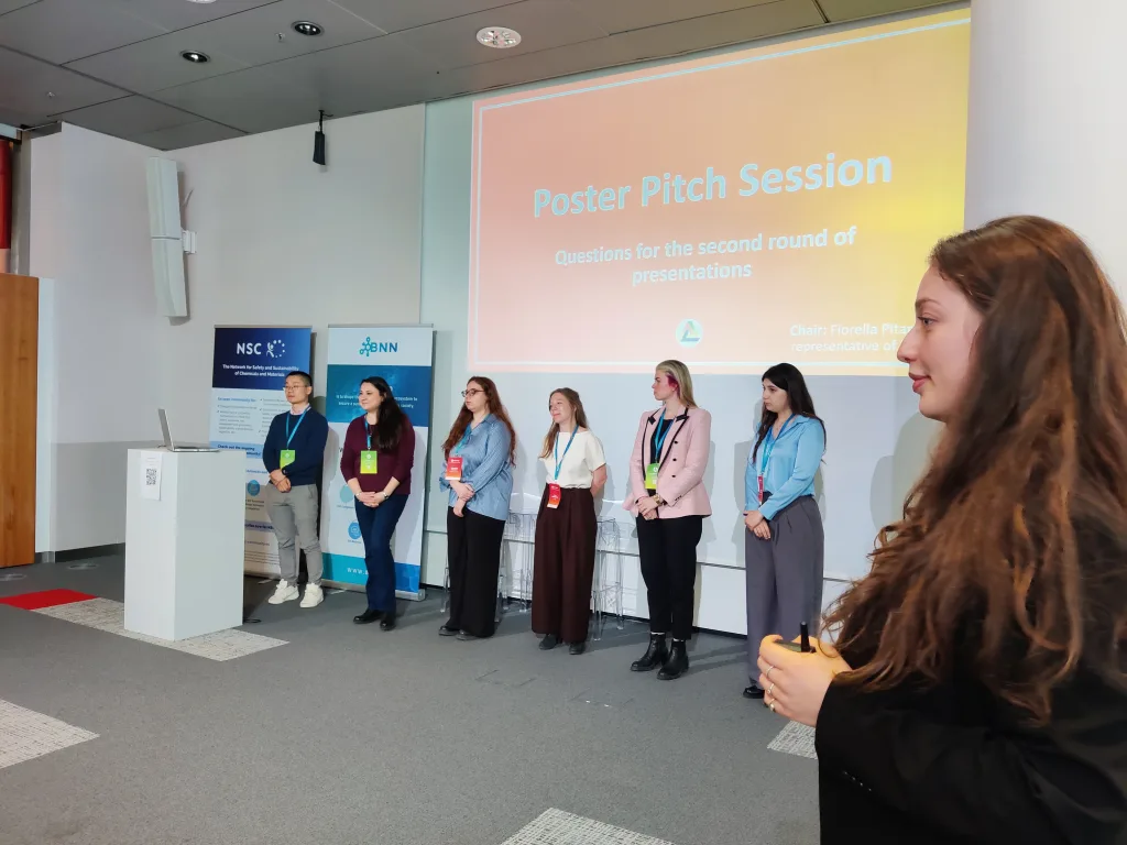 Other presentations focused on sustainability. Within the CheMatSustain project, one poster pitch analyzed the maturity of Life Cycle Assessment (LCA) and Safe-and-Sustainable-by-Design (SSbD) frameworks based on a systematic literature review and discussed how these frameworks influence innovation in chemicals and nanomaterials. Another presentation aimed to identify methodologies for quantifying environmental pressures arising from nanomaterial production and release in order to evaluate the sustainability of new nanomaterials. A further pitch within the INTEGRANO project compared the sustainability of biobased silica produced through three different extraction routes. In addition, a structured approach for translating laboratory-scale processes to industrial scale for prospective LCA of novel chemicals and materials was presented.
