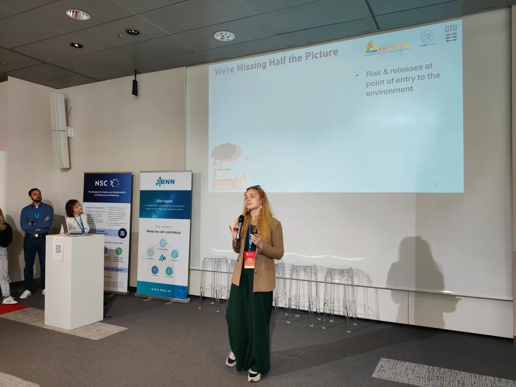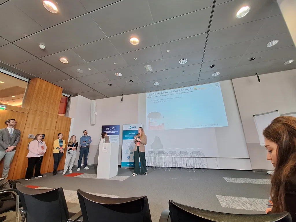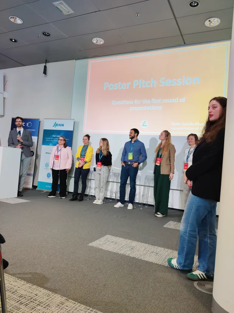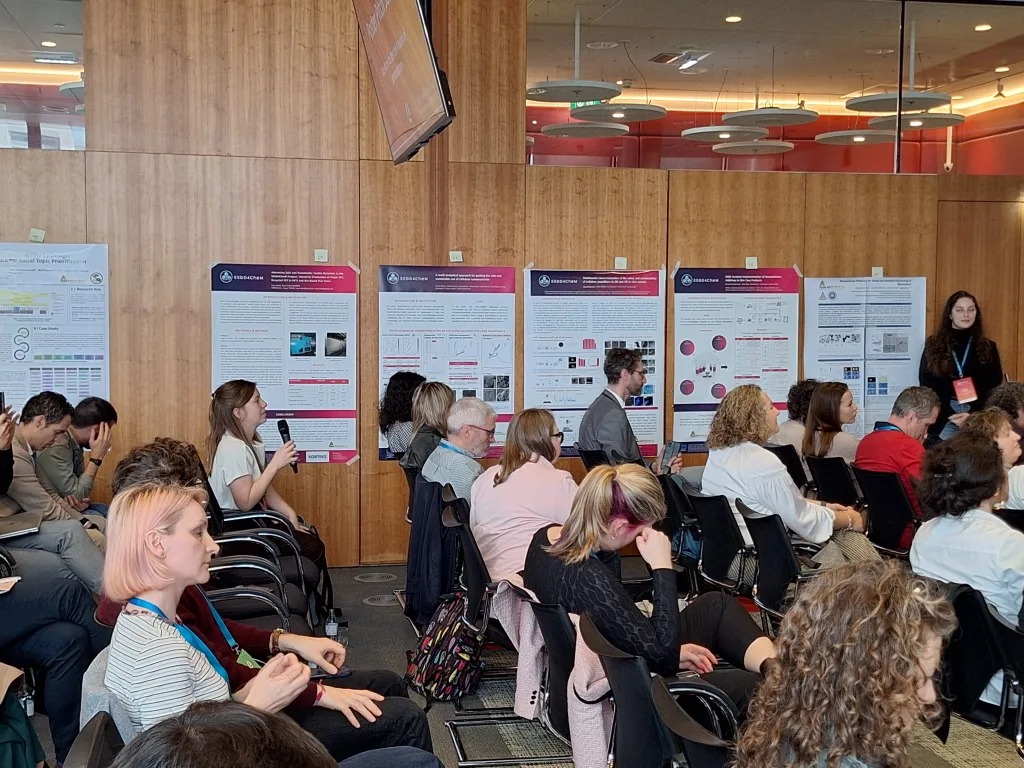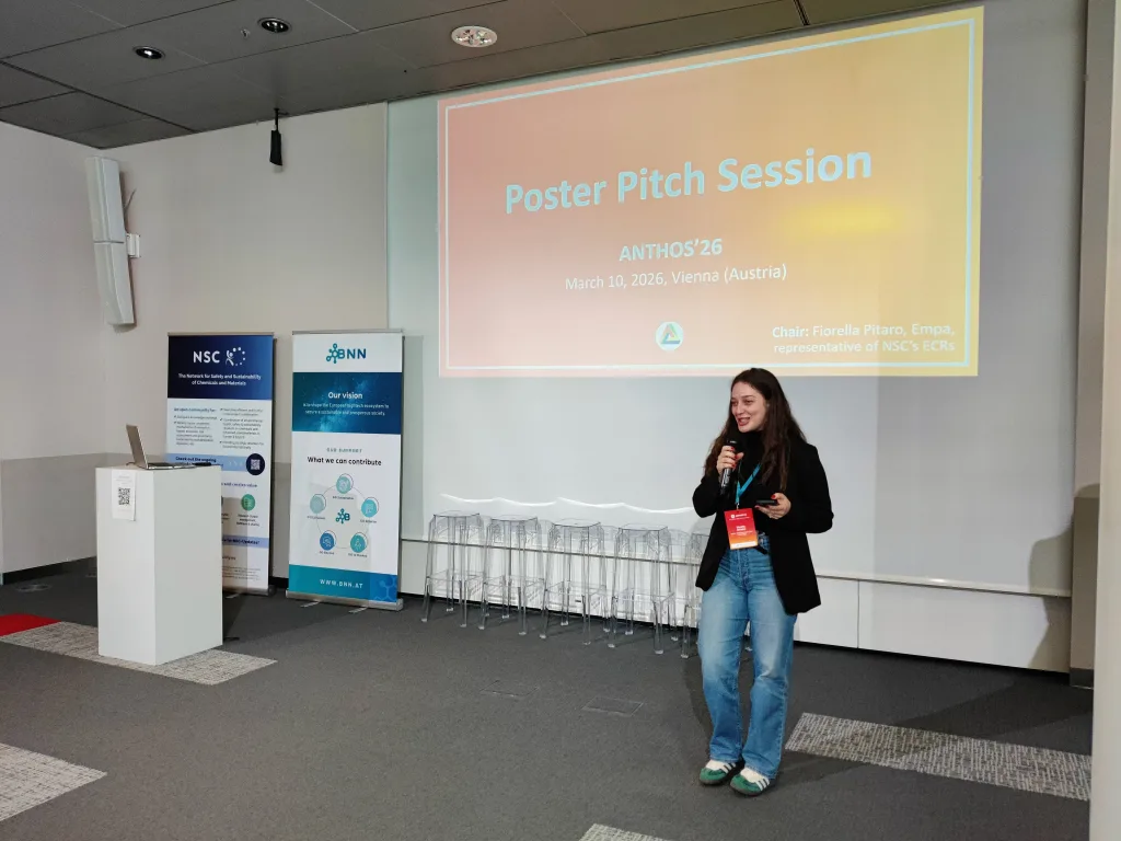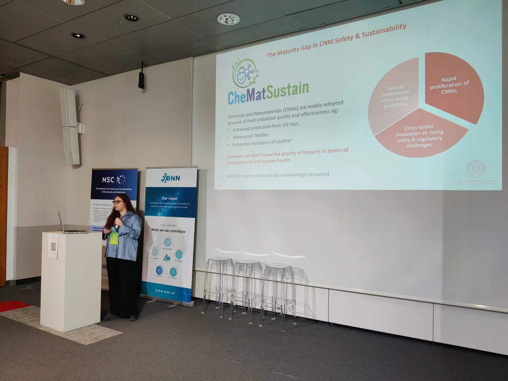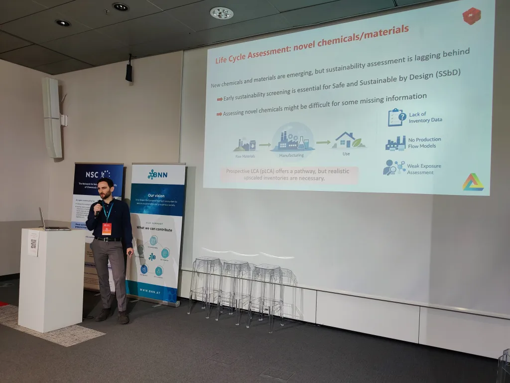 Other presentations focused on sustainability. Within the CheMatSustain project, one poster pitch analyzed the maturity of Life Cycle Assessment (LCA) and Safe-and-Sustainable-by-Design (SSbD) frameworks based on a systematic literature review and discussed how these frameworks influence innovation in chemicals and nanomaterials. Another presentation aimed to identify methodologies for quantifying environmental pressures arising from nanomaterial production and release in order to evaluate the sustainability of new nanomaterials. A further pitch within the INTEGRANO project compared the sustainability of biobased silica produced through three different extraction routes. In addition, a structured approach for translating laboratory-scale processes to industrial scale for prospective LCA of novel chemicals and materials was presented.
