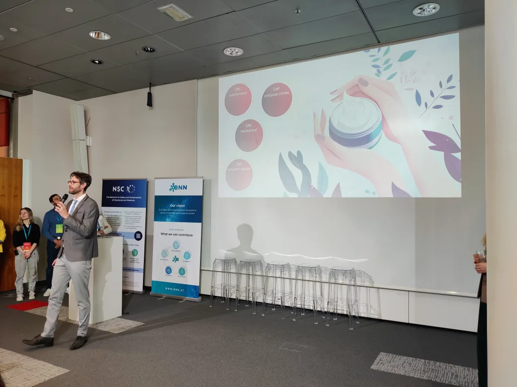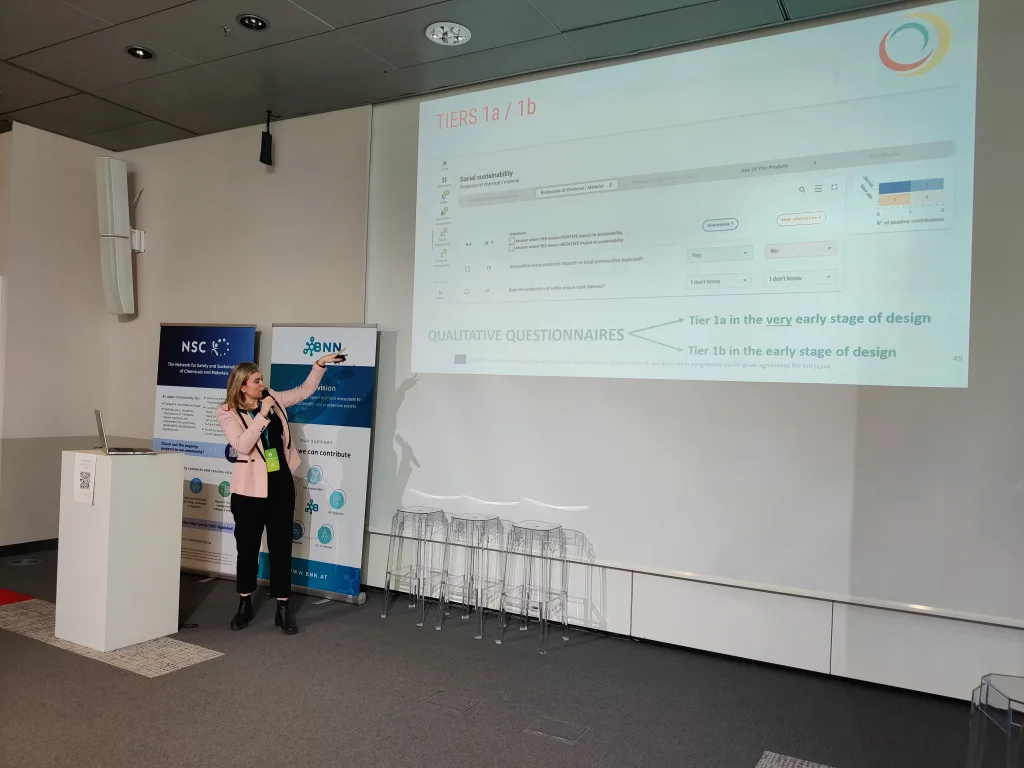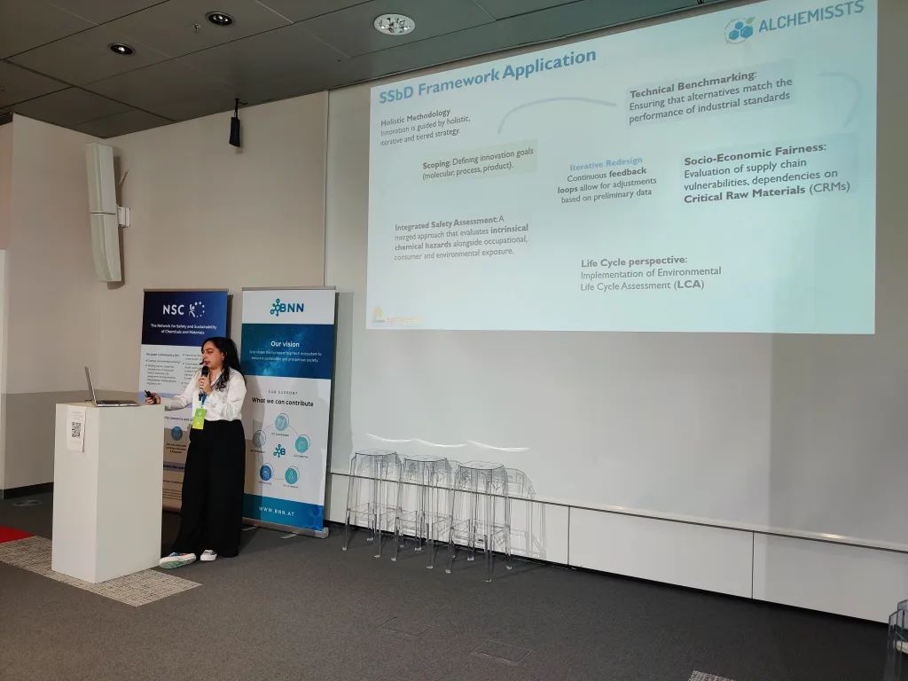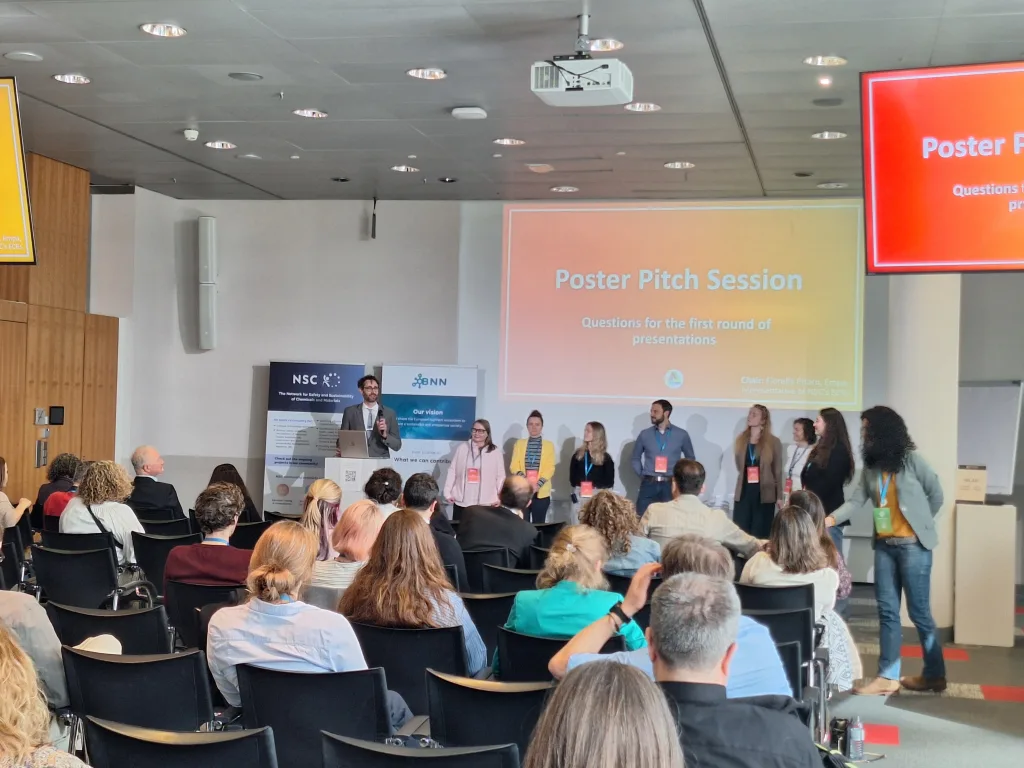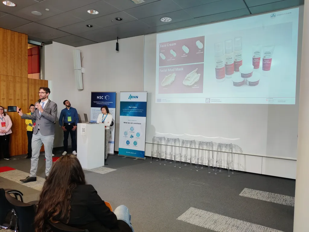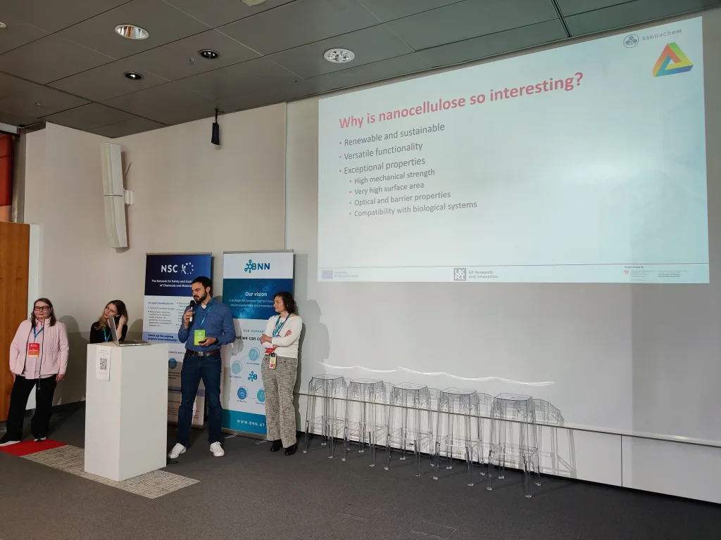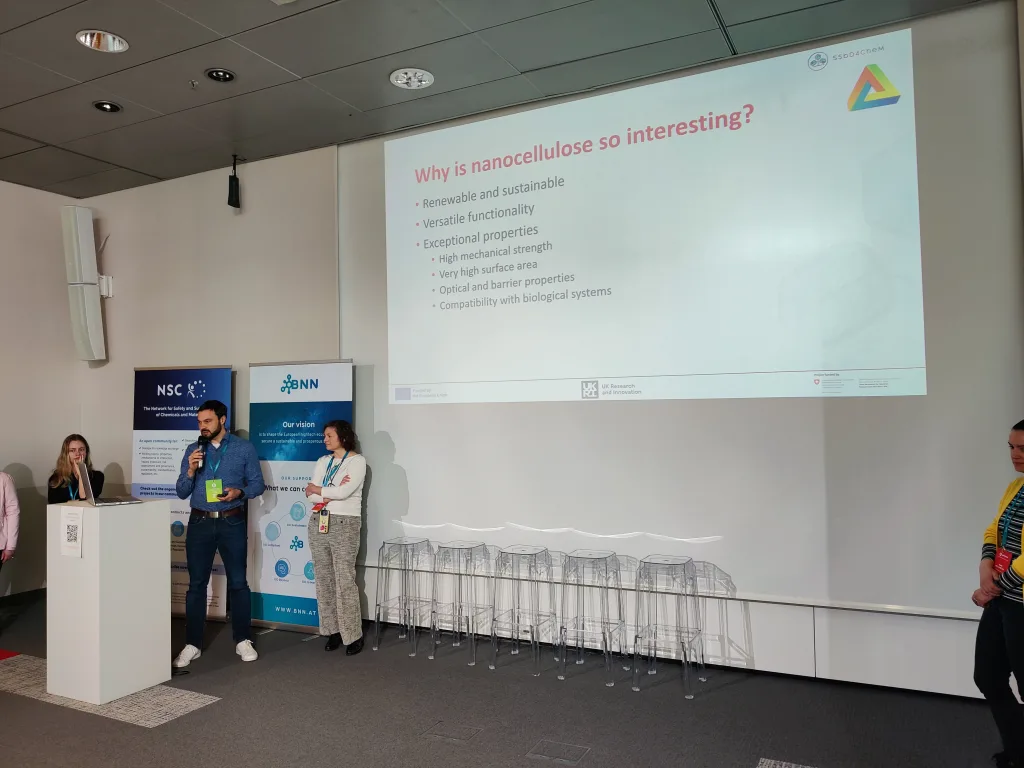Additional topics included two pitches from the SSbD4CheM project. One focused on nanocellulose fibres and their safety testing, while the other introduced cosmetic product prototypes based on nanocellulose fibres. Another presentation from the ELEGANCE project demonstrated the development of new printed electronics within the context of SSbD and highlighted the challenges associated with designing materials at very early stages when the final application was not yet clearly defined. Within the AlChemiSSts project, the developed approach for applying the SSbD framework was presented, including insights from three of the project’s seven case studies.